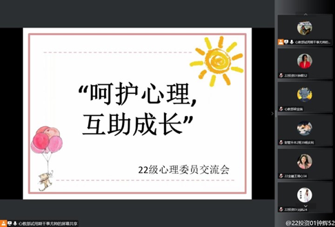 为帮助2022级心理委员明确自身的职责与工作,宣传心理健康方面的知识,解决班级同学的心理问题,更好的协助学校心理咨询中心开展各项心理健康教育工作,日本精品一区二区心教部于11月15日中午在线上召开了以“呵护心理,互助成长”为主题2022级心理委员交流会。