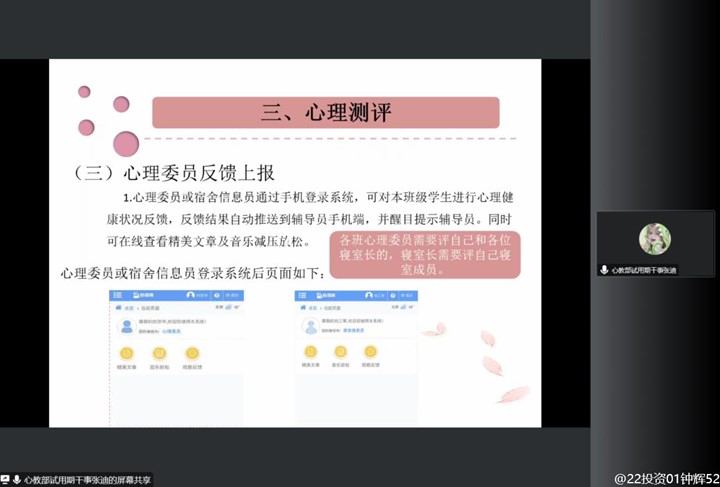 最后心教部干事张迪讲述了心理测评的反馈上报流程和心理测评的账号密码修改步骤,并在讲述过程中提出了寝室和班级出现心理危机的解决办法,有利于各班心理委员和寝室长帮助本班同学解决或缓解心理危机。