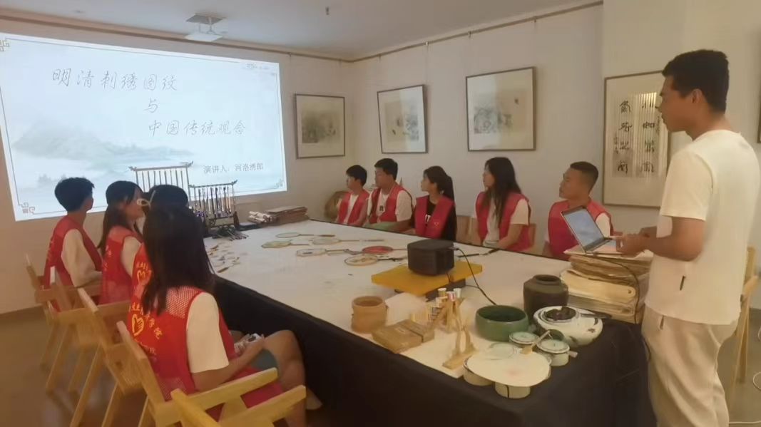 在赵老师的带领下,队员们一同来到了刺绣陈列室。赵老师对河洛刺绣文化进行了详细的讲解,比如南北方刺绣的差异、不同寓意的民间刺绣纹饰等,并展示了明清刺绣实物,为大家答疑解惑。精美的刺绣和丰富的内涵,让同学们领略到了刺绣文化之美。