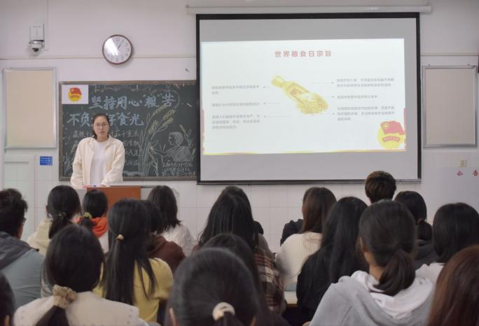 伴随着嘹亮的团歌声,主题团课正式开始。在本次团课中,团支书强调要不忘初心,不负“粮”心,铭记每一粒粮食的来之不易,并且邀请各班学生代表发表自己的观点和看法,引导学生正确认识粮食的重要性,从而树立正确的粮食观,保障国家粮食安全。