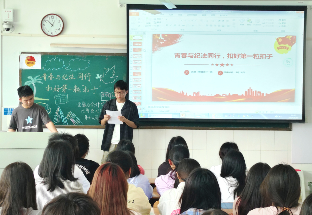 为学深悟透习近平总书记关于党的纪律建设重要论述和重要指示批示精神,推动党纪学习教育走深走实,引导广大青年学纪于先、知纪于身、明纪于心、守纪于行。23智会01、23智会02、23智金 01、23智金02、23智金03、23CIMA01、23CIMA02、23ACCA01、23ACCA02召开以“青春与纪法同行,扣好‘第一粒扣子’”为主题的团课活动。