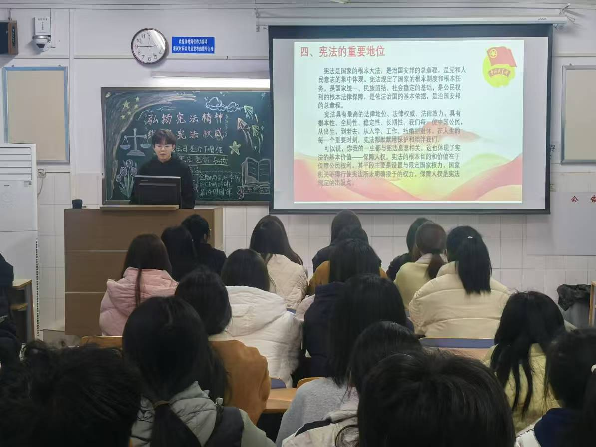 伴随着同学们嘹亮的团歌声,本次主题团课正式拉开帷幕。首先,由团支书向同学们介绍了我国宪法的发展历程,带领同学们走近宪法。在宣讲环节,学生代表通过宣讲,让同学们深刻理解宪法的基本原则,还有一些班级向同学们讲述宪法制定背后的故事,用真人真事来触动人心。最后同学们还观看了宪法宣传视频,团支书就活动内容做出总结,号召同学们懂法、知法、守法,自觉弘扬宪法精神,做新时代青年。