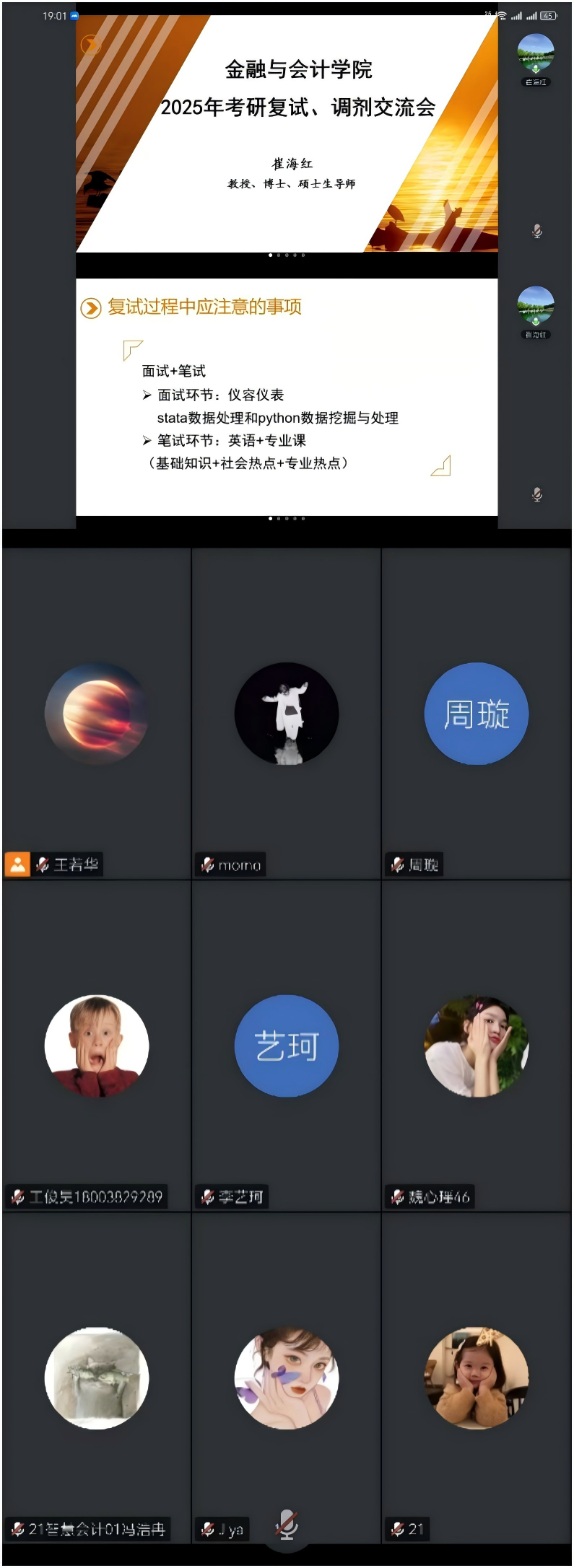 为助力考研学子科学备战复试,提升综合竞争力,3月27日晚7时,我院副院长崔海红通过线上会议平台,为2025届考研复试学生开展专题辅导。党委副书记汪晓伟、毕业班辅导员及全体考研复试学生参会。