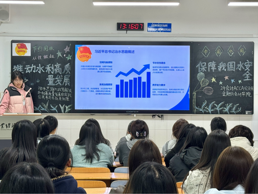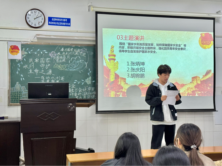 伴随着嘹亮的团歌声,团课活动正式开始,首先,主讲人通过详实的数据和案例,阐述我国水资源现状,如人均水资源量少、时空分布不均等问题,让同学们直观认识到水安全面临的严峻挑战。其次,深入剖析水利高质量发展在防洪、供水、生态修复等方面的关键作用,结合三峡大坝、南水北调等大型水利工程,讲解其在调控水资源、保障民生中的巨大效益。最后,组织同学们分组讨论日常生活中的节水举措及如何向社会宣传水安全知识。