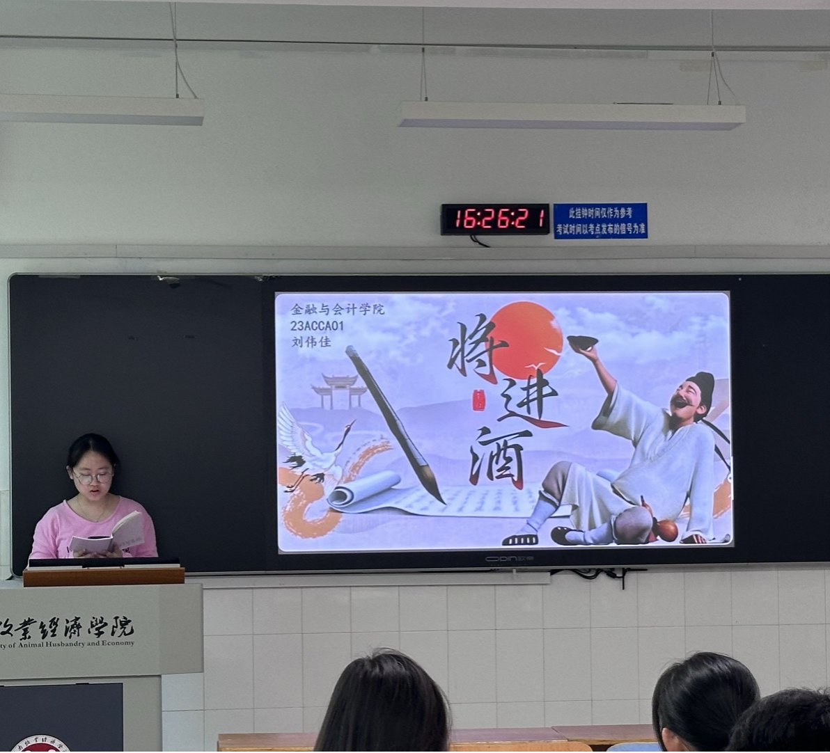 课间的教室里,同学们围绕传统文化的璀璨星河,展开了一场场别开生面的交流。有的同学通过介绍油纸伞,讲述这项能遮风挡雨的非物质文化遗产,如何承载千年匠心,成为流动的东方美学。还有的同学翻开诗卷,以铿锵之声诵读《将进酒》,从"天生我材必有用"的豪情,谈到李白在盛唐与乱世间的狂放与孤独,解读着诗歌中激荡的生命张力与时代精神。每一段分享,都如同打开一扇扇文化的窗,让同学们感受传统文化历久弥新的魅力,现场讨论声此起彼伏,思维的火花不断绽放。
