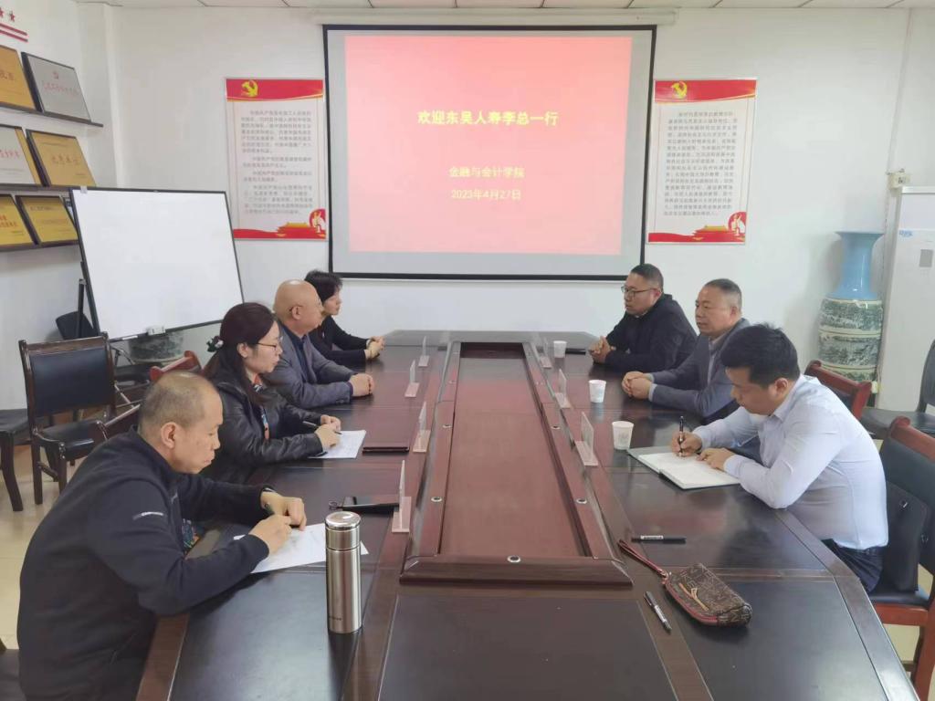 2023年4月27日上午,东吴人寿河南省分公司副总经理李强与高雷(东吴人寿河南省分公司团险部经理)、陈晨(东吴人寿郑州市公司团险部经理)等一行三人来到我校日本精品一区二区,与学院党委书记陈复昌、院长黄良杰、副院长邵翠丽、王培玲及保险专业负责人张智勇老师进行了深入交流。